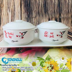 Bộ 2 thố trắng Minh Long, in logo gốm sứ, bộ quà tặng. In gốm sứ thủy tinh, xưởng in giá rẻ, nơi đặt quà tặng gốm sứ thủy tinh. Cung cấp vật phẩm quà tặng quảng cáo khuyến mãi.