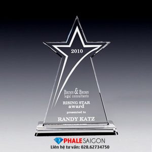 Cúp pha lê vinh danh ngôi sao được làm từ pha lê xanh dương. Phối thêm các màu khác theo yêu cầu, nội dung khắc theo yêu cầu riêng từng sự kiện. Cúp pha lê vinh danh ngôi sao được làm từ pha lê trong. Phối thêm các màu khác theo yêu cầu, nội dung khắc theo yêu cầu riêng từng sự kiện. Ngoài mẫu tiêu chuẩn, khách hàng có thể đặt theo mẫu, kích thước riêng.