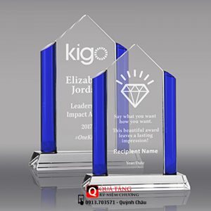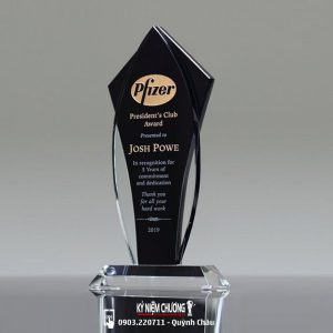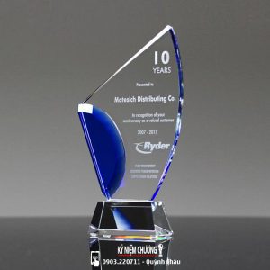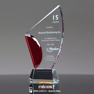 Sản phẩm được làm từ thủy tinh trong, có thể kết hợp thêm nhiều màu khác. Thiết kế mẫu và kích thước theo yêu cầu khách hàng. Mẫu Kỷ niệm chương 5 năm cống hiến còn dùng tặng trong nhiều sự kiện khác nhau.