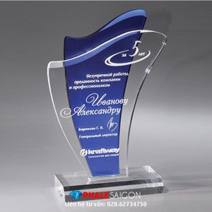 Sản phẩm được làm từ pha lê trong, có thể kết hợp thêm nhiều màu khác. Thiết kế mẫu và kích thước theo yêu cầu khách hàng. Kỷ niệm chương vinh danh 5 năm cống hiến dùng tặng trong nhiều sự kiện khác nhau.
