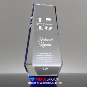 Sản phẩm được làm từ pha lê trong, có thể kết hợp thêm nhiều màu khác. Thiết kế mẫu và kích thước theo yêu cầu khách hàng. Kỷ niệm chương vinh danh 15 năm cống hiến dùng tặng trong nhiều sự kiện khác nhau.